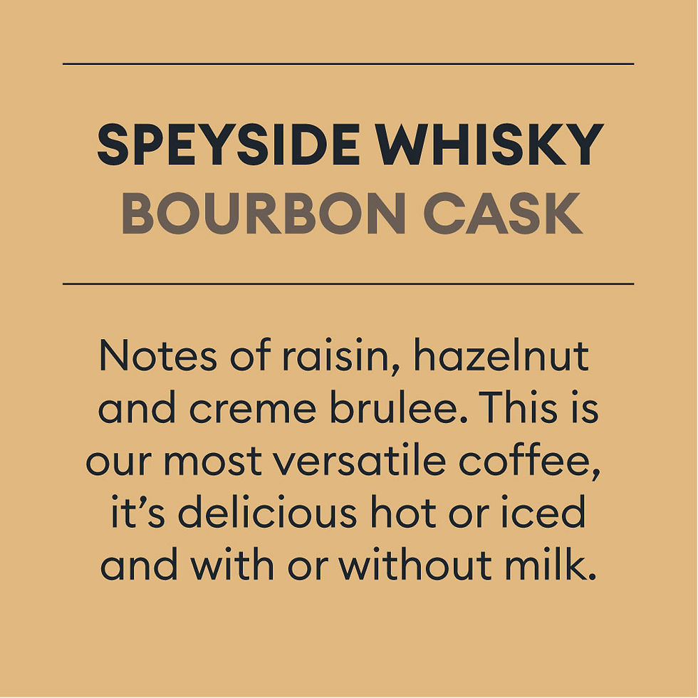 Premium single origin beans are carefully rested in whisky barrels, absorbing subtle notes of oak and smoky sweetness.